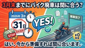 | 自分で廃車手続き | 無料〜350円 | 半日〜1日 | 廃車の流れが覚えられる | 平日に時間が必要、バイク処分は別 |