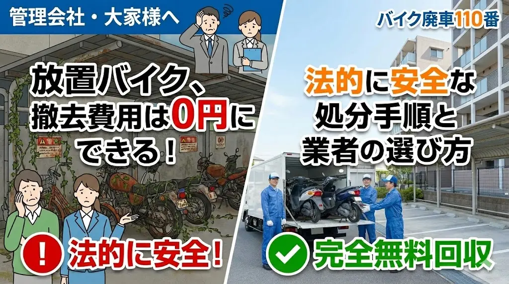 バイク廃車110番|管理会社・大家様へ 放置バイク撤去費用は0円にできる|法的に安全な処分手順と業者の選び方|完全無料回収