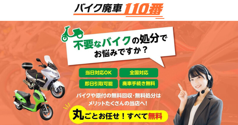 『バイク廃車110番』ではオートバイ・原付バイクを無料で出張引き取りいたします。