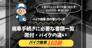 バイクを廃車するときには、必要な書類があります。 原付と軽二輪・大型二輪では準備すべきものが異なるので注意しましょう。 原付(125cc以下)の廃車に必要な書類 • 標識交付証明書 •&nb […]