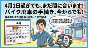 👉バイク廃車110番メインページへ 「3月31日までに廃車手続きをしようと思っていたのに、間に合わなかった……」 4月に入ってからそう後悔しているお客様からのご相談が、バイク廃車110番に多く届きます。結論から言うと、4 […]